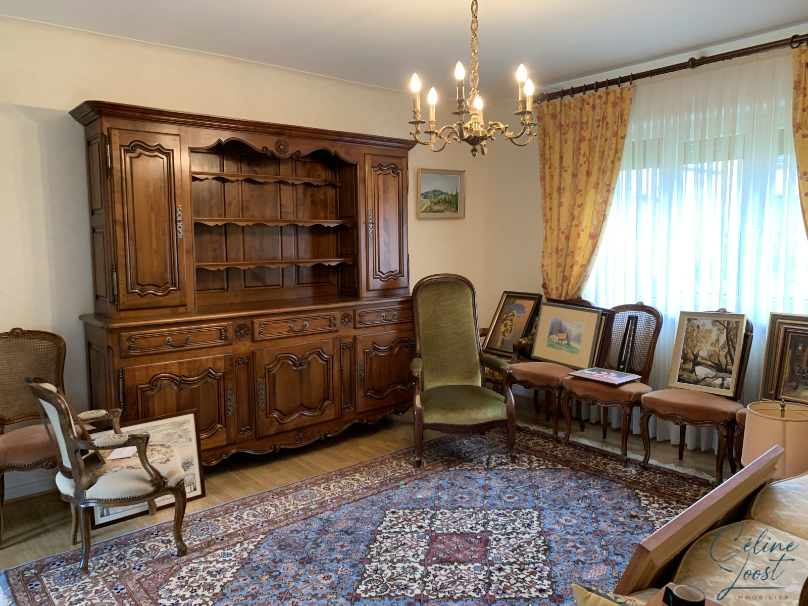 Elle comprend, au RDC : une entrée, une cuisine équipée (15,5 m2), une pièce attenante (15,5 m2), une petite véranda (8,7 m2), un salon/séjour (30 m2), une salle d'eau et un cellier.