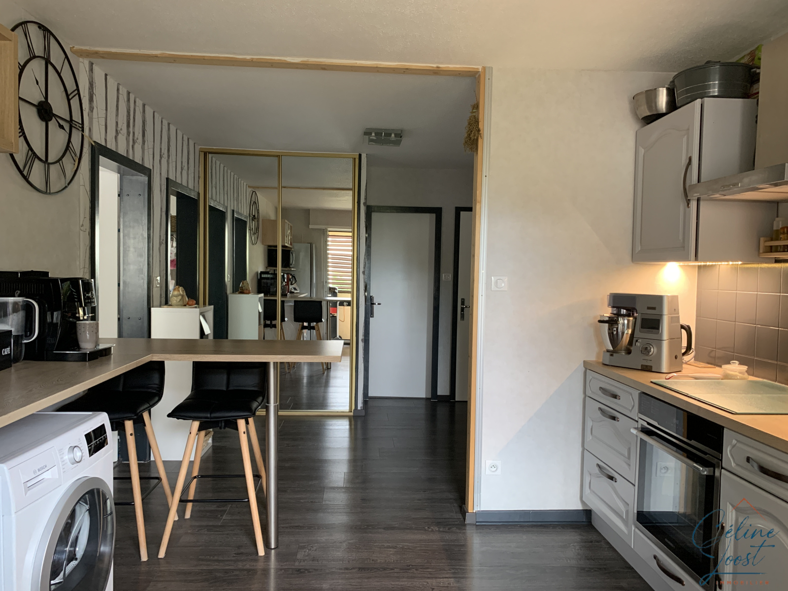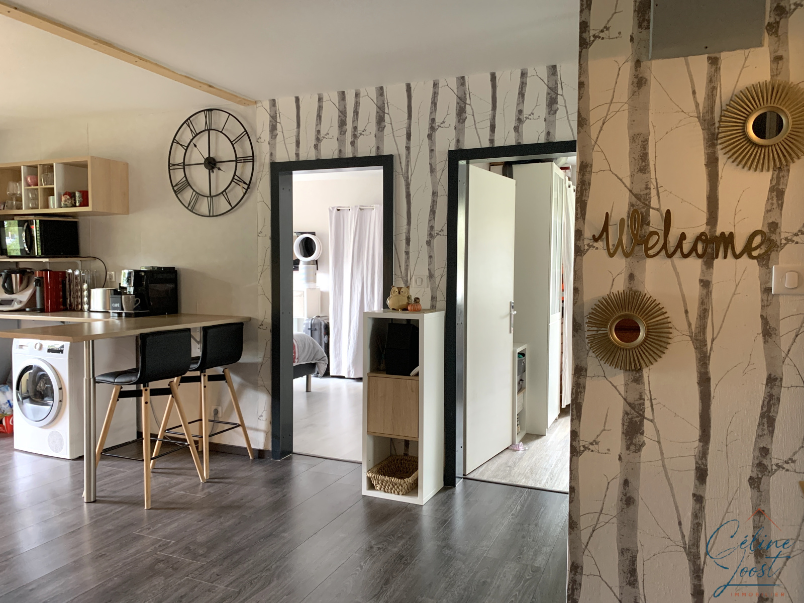 Il comprend : un hall d'entrée avec placard, une cuisine équipée ouverte, une pièce de vie, deux chambres, une SDB et un WC séparé.