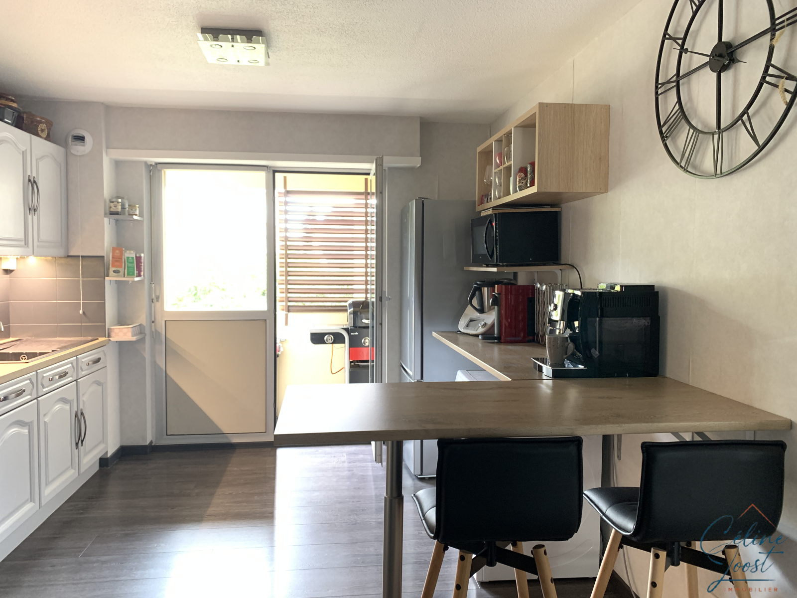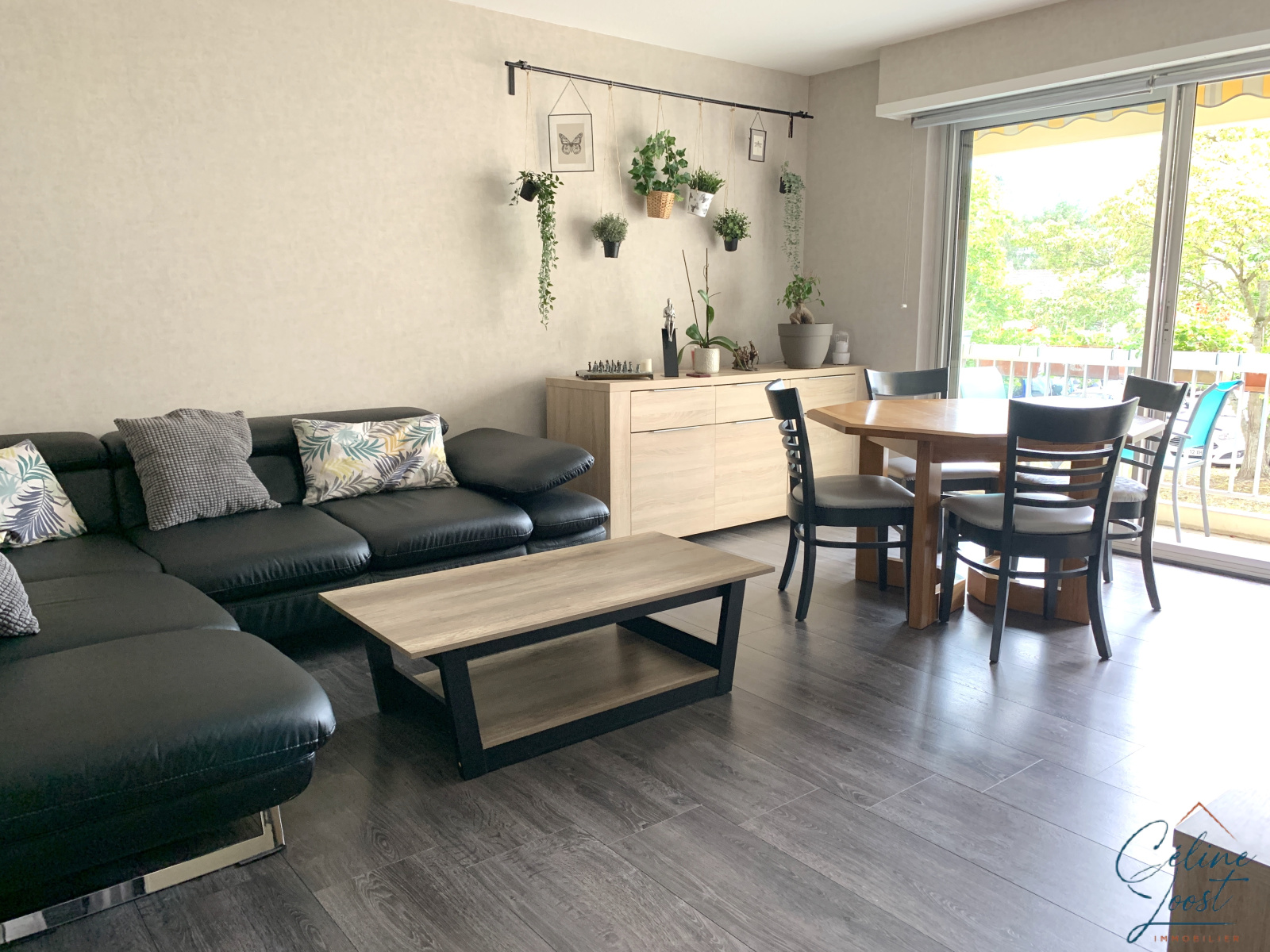Un long balcon exposé Sud, avec vue arborée et sans vis à vis, est accessible par le séjour et la cuisine.
