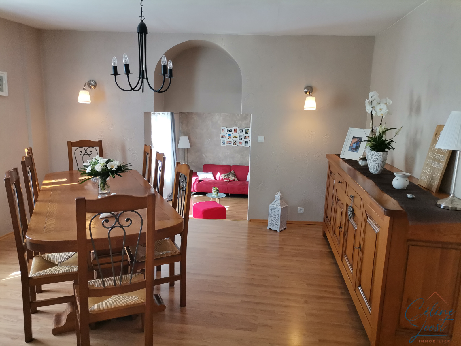 Il se compose : d'un sas d'entrée avec placards, d'un grand couloir dispatchant toutes les pièces dont un grand salon/séjour avec demi-niveau, de 3 chambres, d'une cuisine équipée indépendante, d'une salle d'eau, d'un cellier et d'une terrasse couverte. Une cave complète le bien.