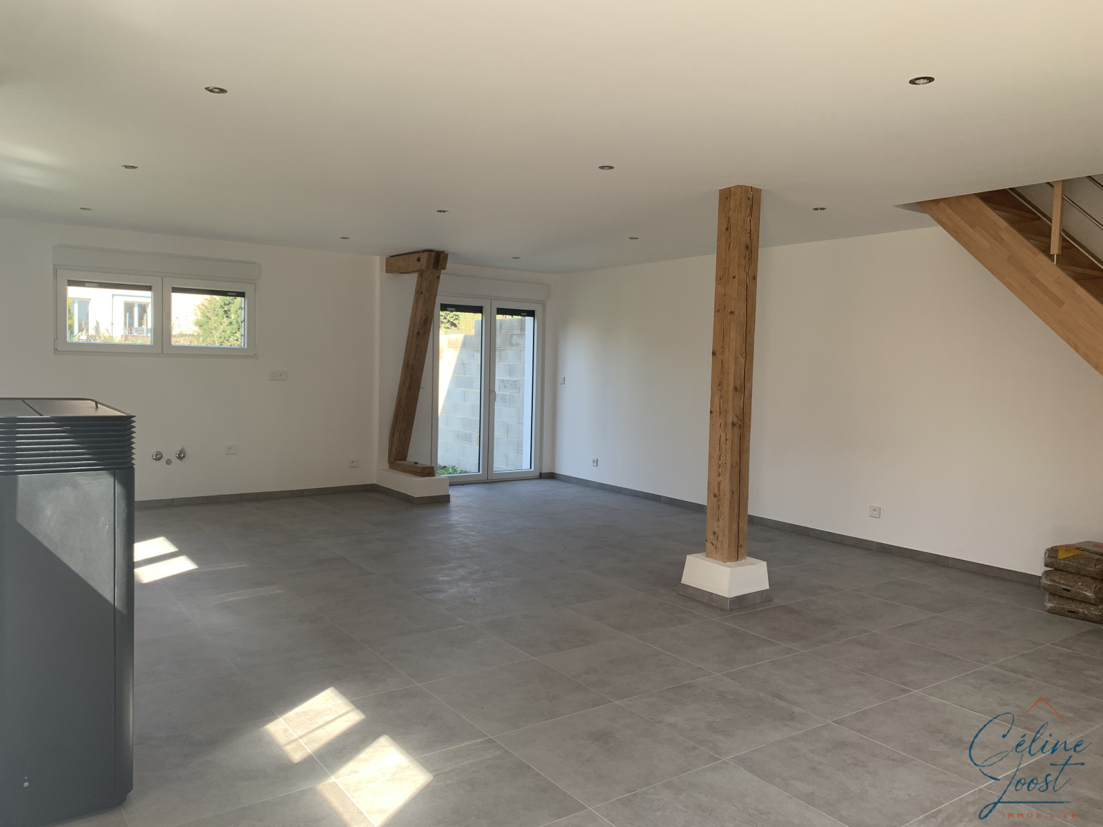 Au RDC : un grande pièce de vie cuisine (à équiper) / séjour avec accès de plain-pied à l'extérieur et un WC (environ 55 m2)