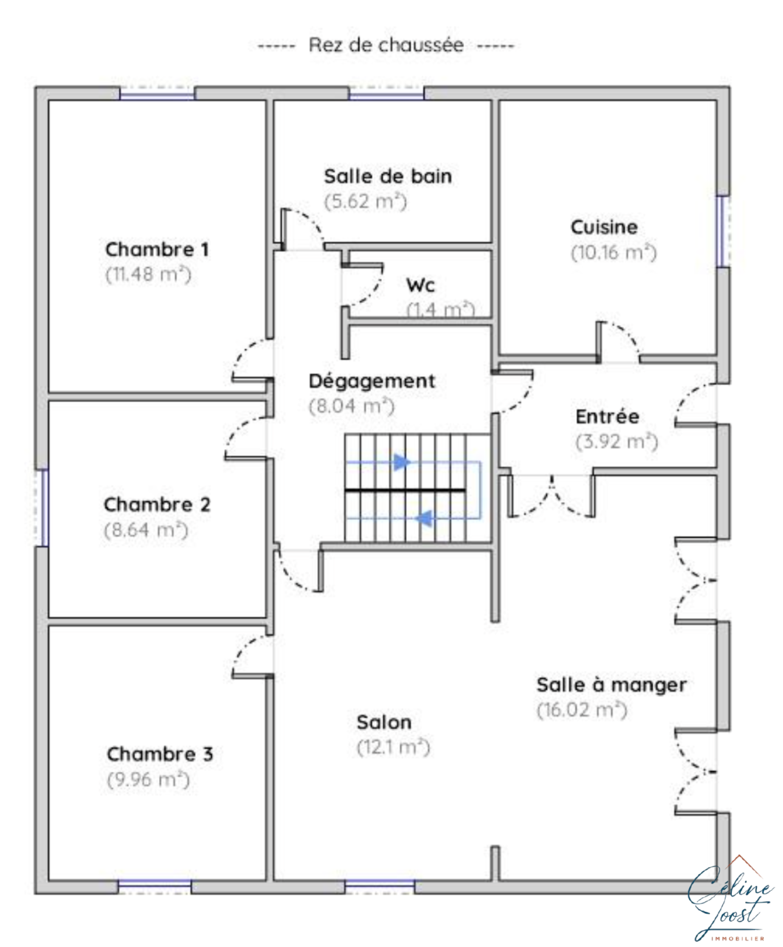 Au RDC : une entrée et un dégagement avec placard mural, une cuisine équipée récente (cuisinella), un salon / séjour avec poêle à pellets et accès à la terrasse Est par 2 portes fenêtres, deux chambres, une chambre d'enfant ou bureau, une SDB et un WC séparé.