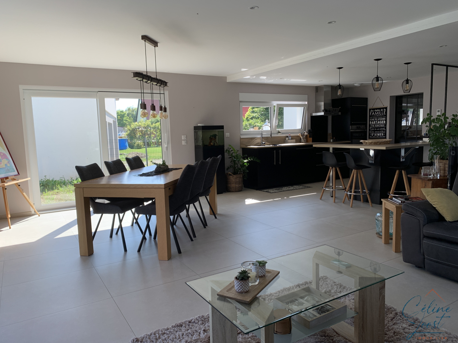 Vous y trouverez au RDC, une entrée donnant sur un bel espace de vie ouvert avec 2 baies vitrées permettant d'accéder aux terrasses Sud et Est, une très belle cuisine équipée ouverte completée d'un cellier et d'une buanderie, un WC et un double garage est accessible par l'intérieur.