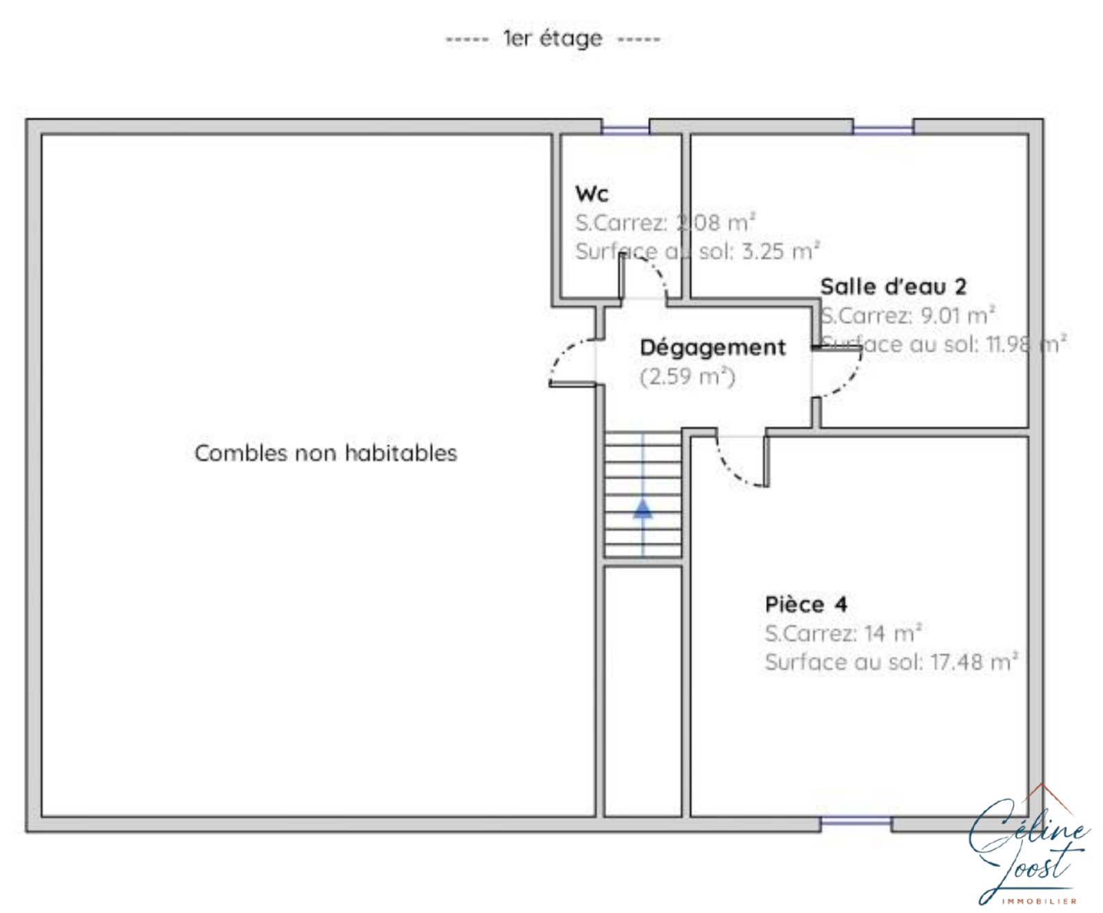 Au 1er : une chambre, un salle de bains, un WC et un grand grenier : possibilité de créer 2 chambres supplémentaires.
