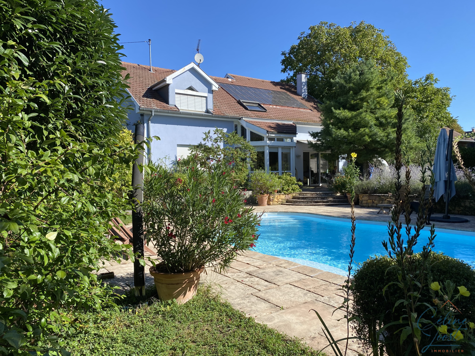 Architektenhaus (Bj 1994) in Kunheim, auf sehr schönem Anwesen mit einer Wohnfläche von 227 m2, inmitten einer grünen Oase von über 2800 m2 Garten und Wiese gelegen und mit direktem Zugang zum Colmarer Kanal.