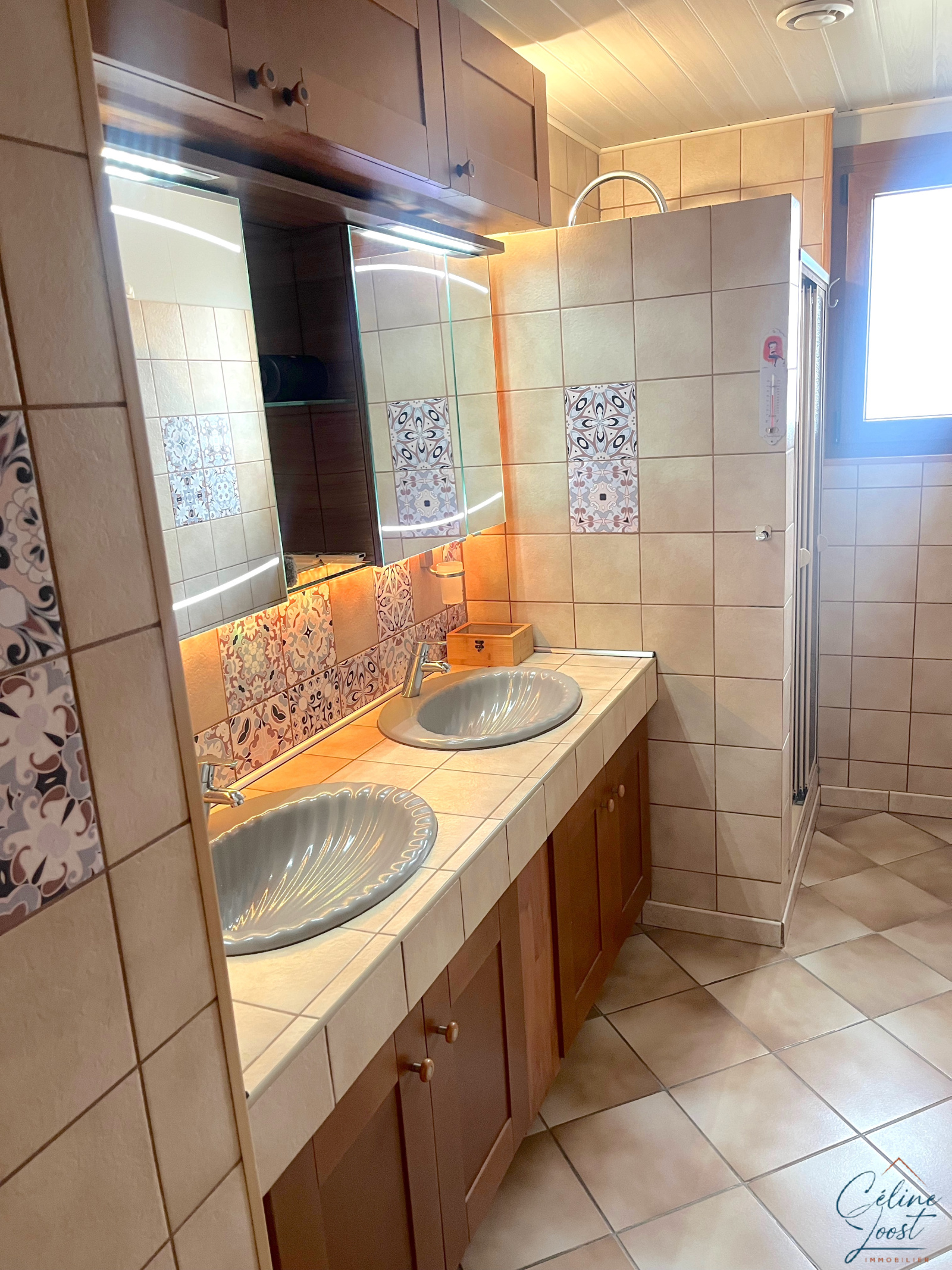 Au RDC : une entrée et un dégagement, une cuisine équipée indépendante (mais possibilité d'ouverture sur la pièce de vie), un salon/séjour avec un kacheloffe, 2 chambres et une 3e pour enfant ou bureau, une salle d'eau avec douche et double vasque et un WC séparé. Une terrasse de 25 m2 orientée Ouest est accessible par la pièce de vie et la cuisine.