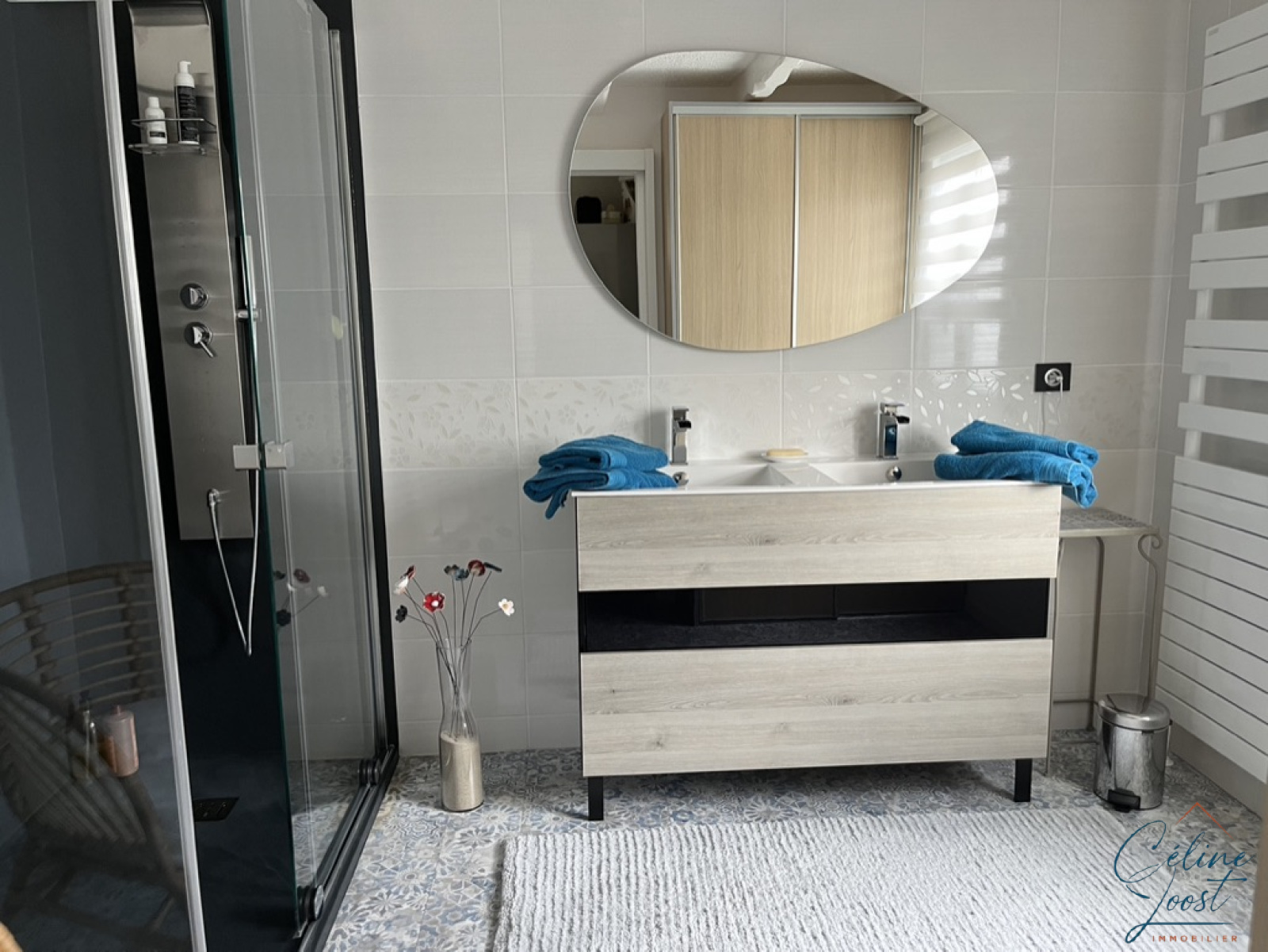 - Au RDC : une lumineuse entrée avec baie vitrée est ouverte sur la cuisine totalement équipée, un spacieux et cosy salon / séjour de 43 m2 est agrémentée d'une cheminée, une salle d'eau neuve avec grande douche et un placard aménagé et un WC.