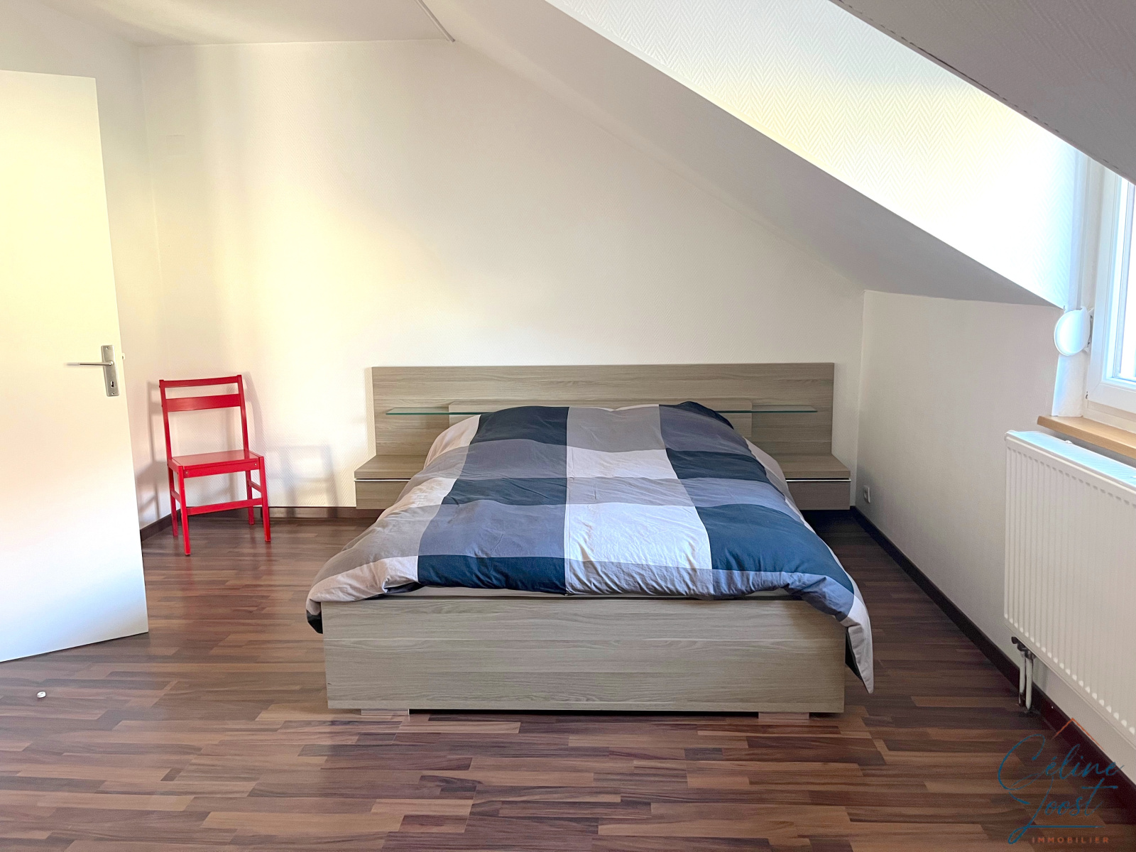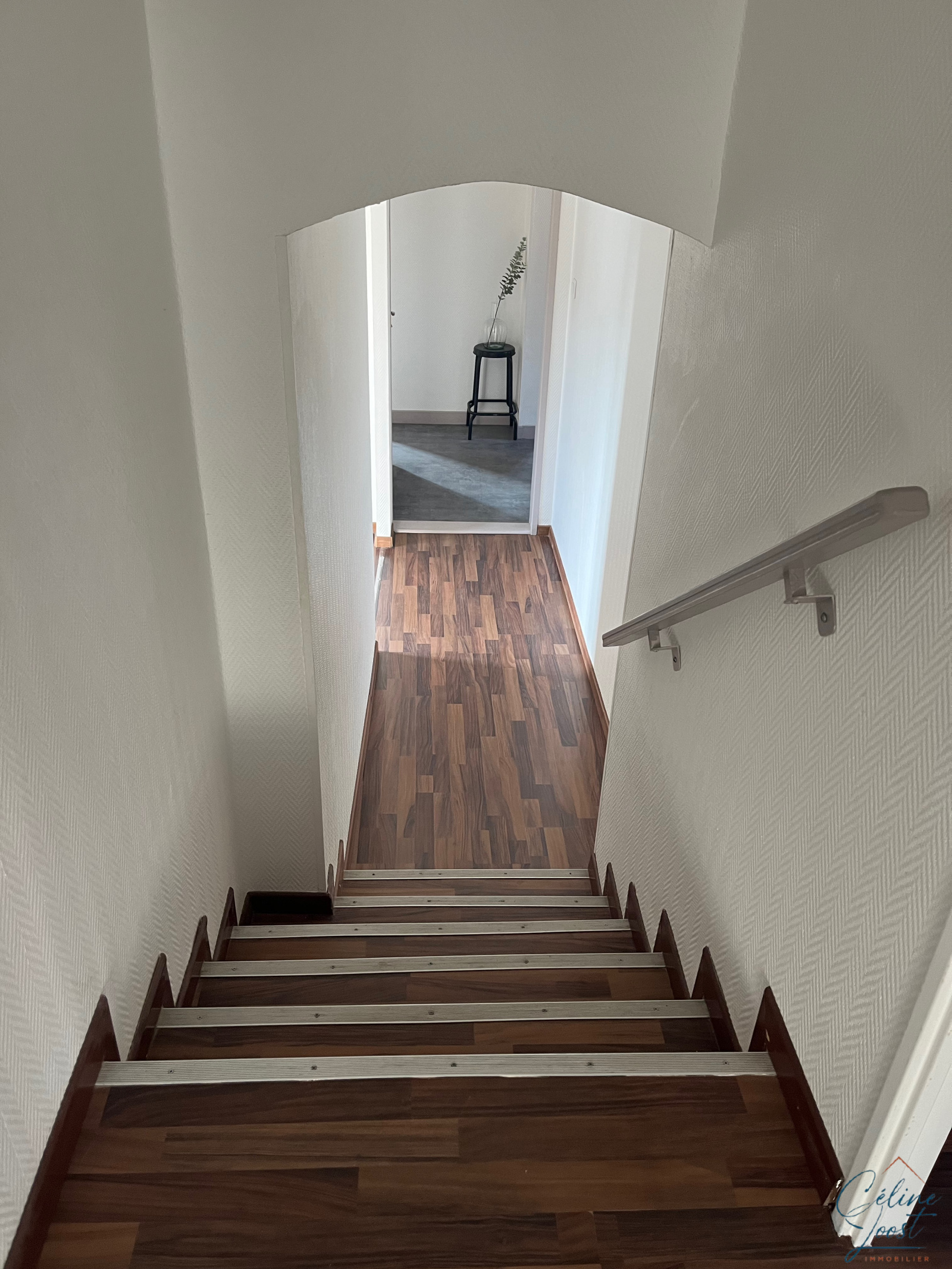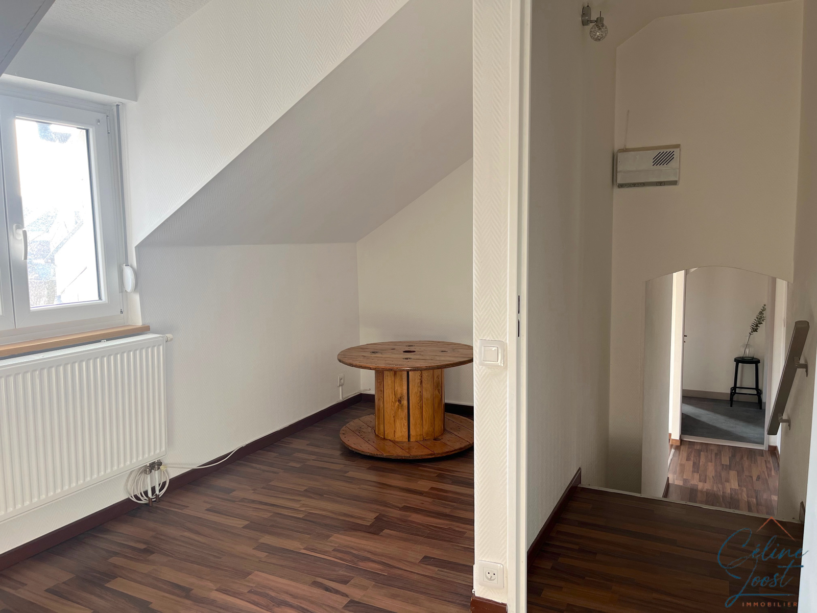 Vous y trouverez une entrée, un salon/séjour lumineux (expo Sud), une cuisine équipée séparée, une salle de bains avec WC, un espace ouvert qui peut servir de bureau, cellier ou dressing. Puis, un demi-niveau supérieur vous mènera aux deux chambres.