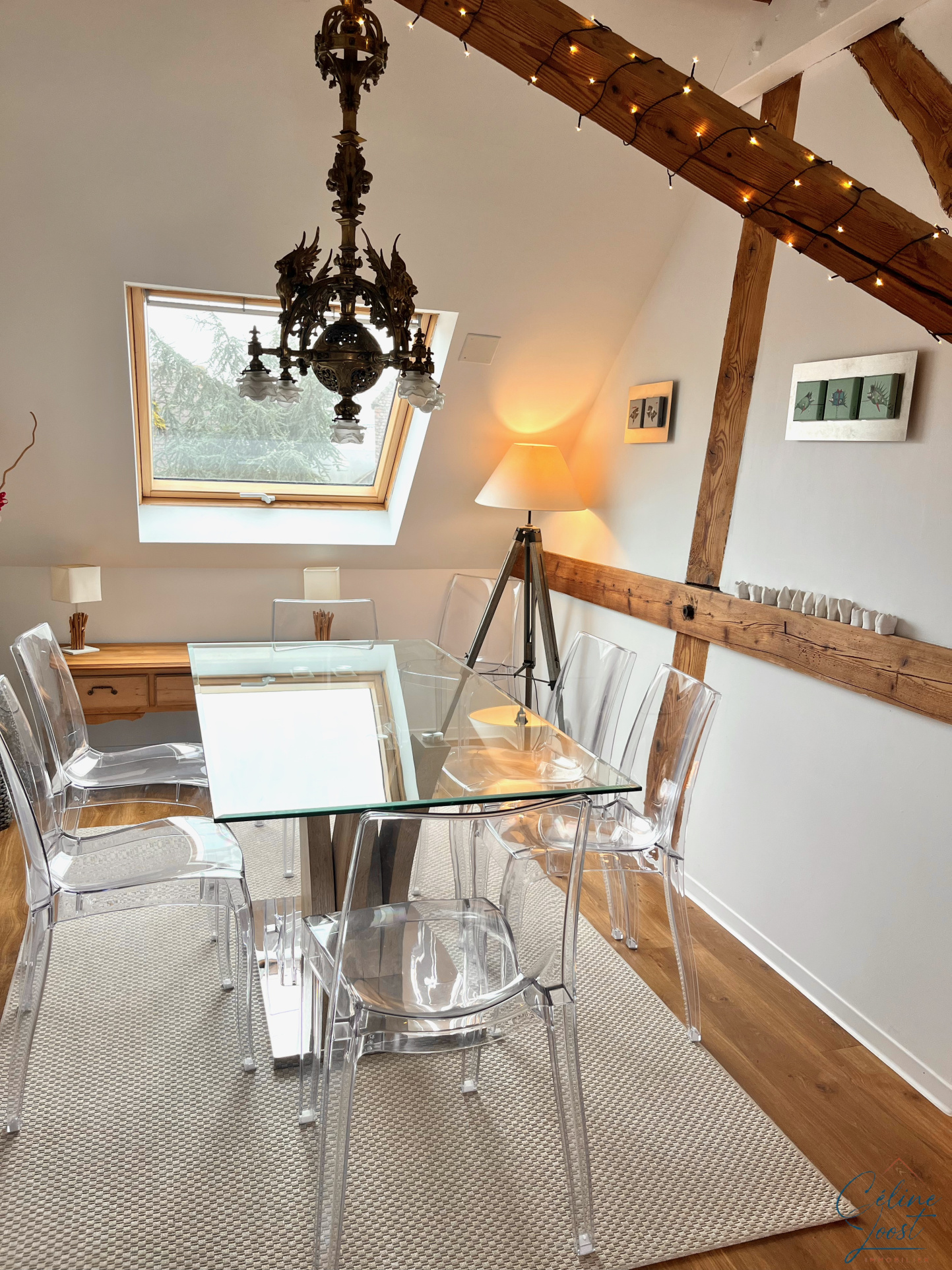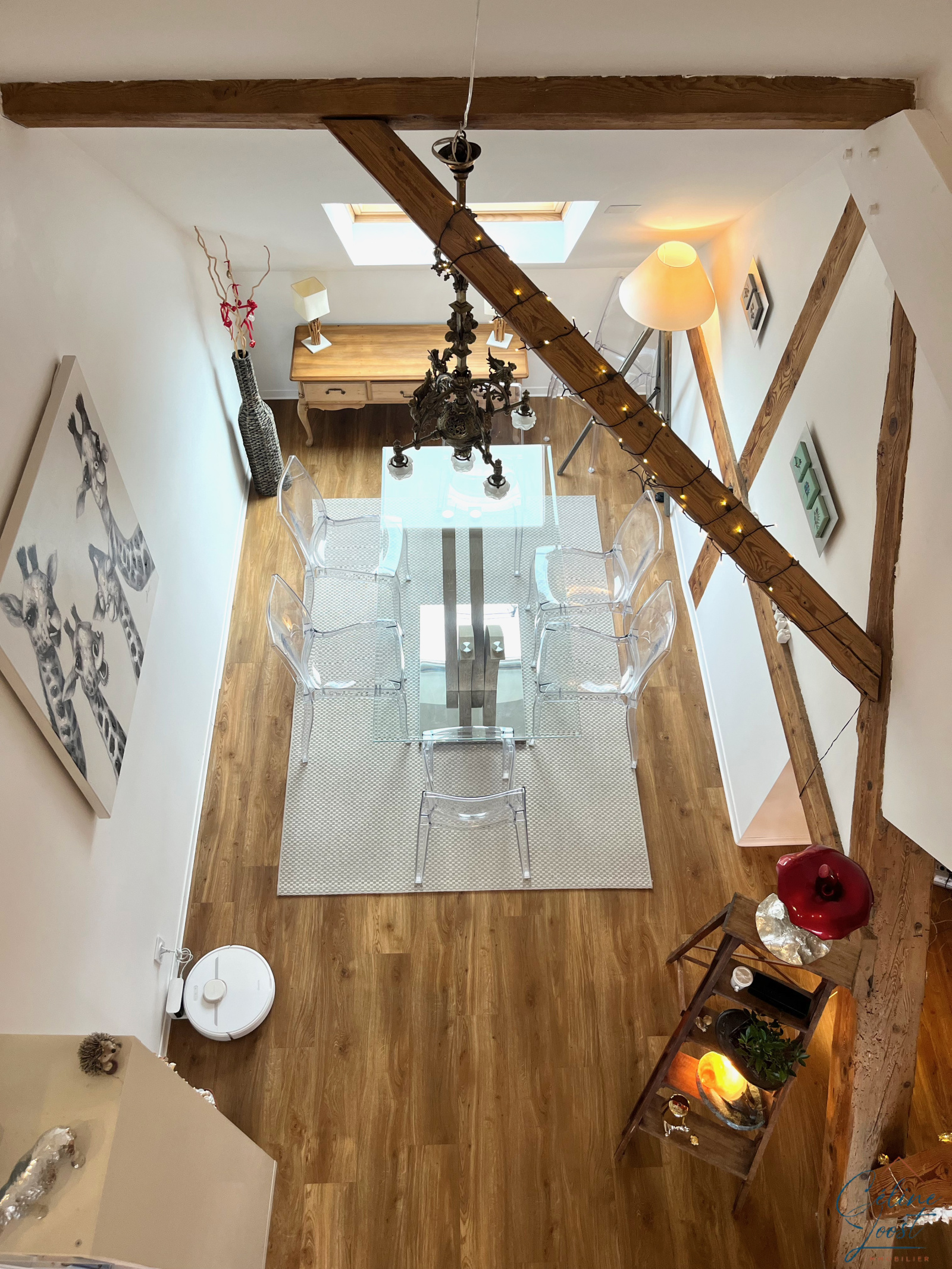 Situé au 2e et dernier étage d'une ancienne dépendance réhabilitée en 2016, il offre une surface de 103 m2 habitables et 149 m2 au sol. Aménagé en DUPLEX, vous trouverez :