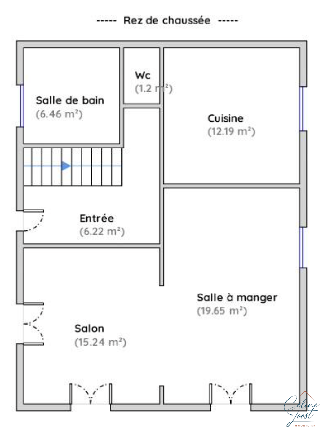 - Au RDC : une entrée, un salon/séjour de 30 m2, une cuisine indépendante (12m2), une SDB et un WC.